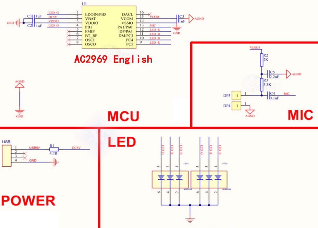 離線語音識別芯片-小夜燈AC2969英語版方案原理圖: