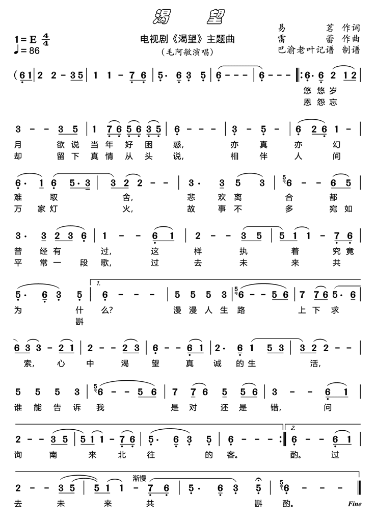 電視劇《渴望》主題曲,由 易茗 作詞。